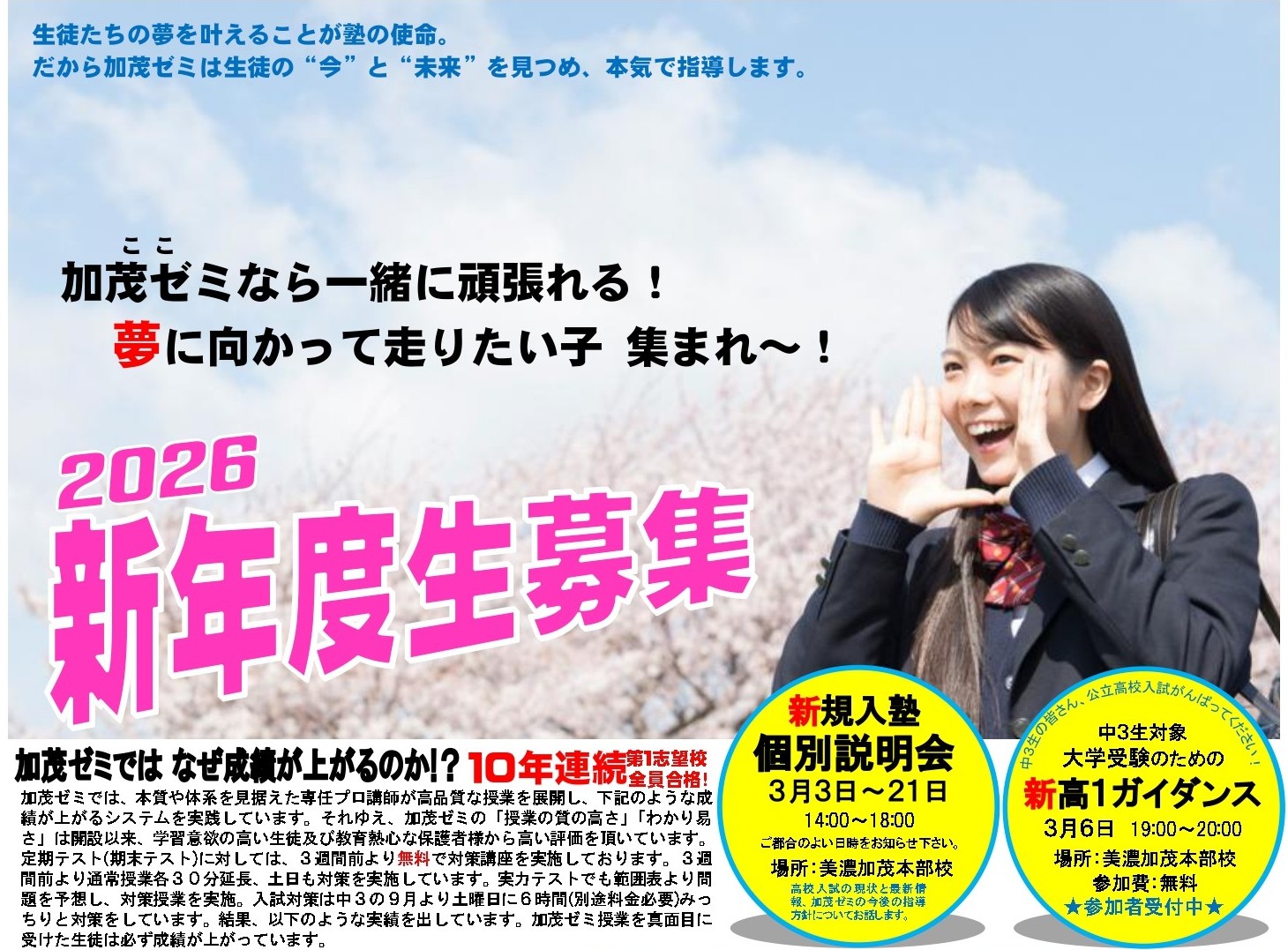 地元密着で実績を出し続ける学習塾。美濃加茂市、可児市、富加町、川辺町、坂祝町、八百津町の小学生、中学生、高校生を対象に定期テスト5教科400点以上、+50点アップを目指します。集団授業と個別指導の両方に対応しており、本部校は地域内で唯一、バス送迎も行います。きょうだい割引(2人目3割引、3人目無料)もあります。無料体験授業、入塾説明会を随時受付中。